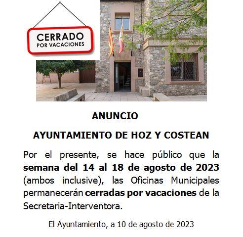 El Ayuntamiento de Hoz y Costean informa que las Oficinas Municipales de la localidad permanecerán cerradas durante los días 14 hasta el 18 de agosto, ambos inclusive, por vacaciones de la Secretaria-Interventora.