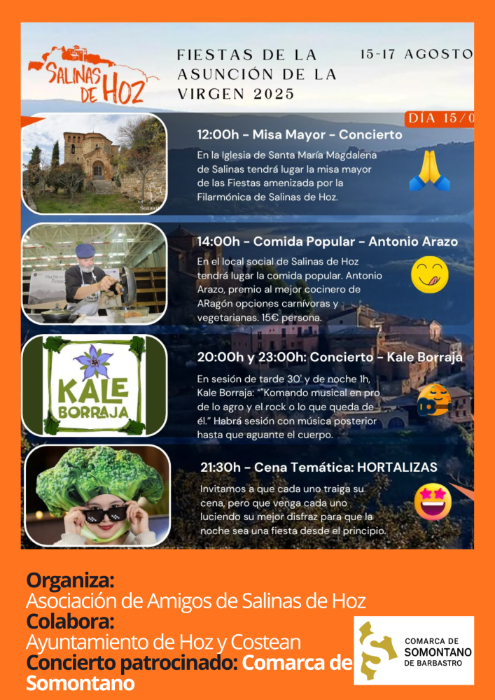 Estas Fiestas han sido organizadas por la Asociación de Amigos de Salinas Salinas de Hoz, han contado con la colaboración del Ayuntamiento, y, en el apartado musical, la Comarca de Somontano ha subvencionado la actuación del grupo.