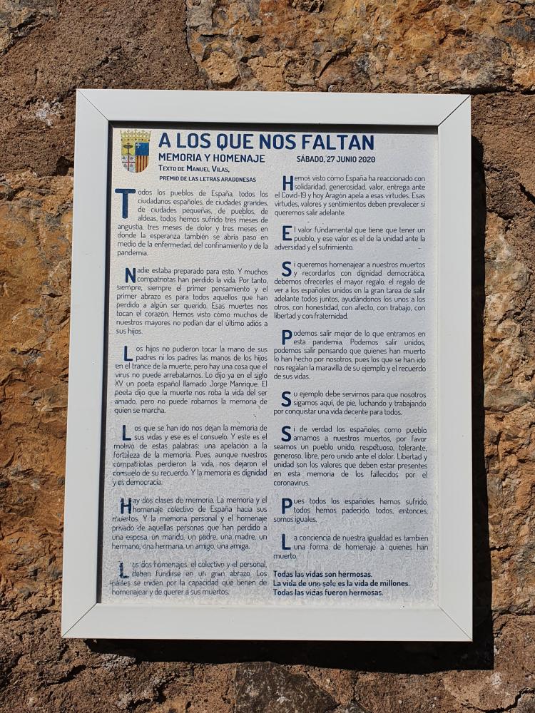 El acto llevó el nombre de “A los que nos faltan” y comenzó con la plantación de la carrasca, símbolo de la identidad de Aragón, una especie abundante en todos los territorios de España con el que se pretende manifestar la solidaridad, afecto, hermandad y causa común. A continuación se instaló una placa de cerámica elaborada en el Taller-Escuela de Muel y finalmente se procedió a la lectura de un texto de Manuel Vilas, premio de las Letras Aragonesas.